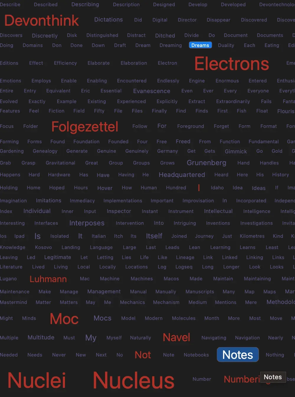 I confess that I have travelled this entire road and have finally, finally arrived at the point where I have pushed the software — and the hardware too — out of my field of vision, and above all, I no longer let them absorb my thoughts, my thinking power. I write notes as before, but much more, as my brain and my soul and my time have much more space now. My Zettelkasten grows and flourishes. But I no longer create Maps of Content. I no longer push the electrons by hand into orbit around their nucleus, but hand that task over to a fantastic piece of software that simply takes it off my shoulders.